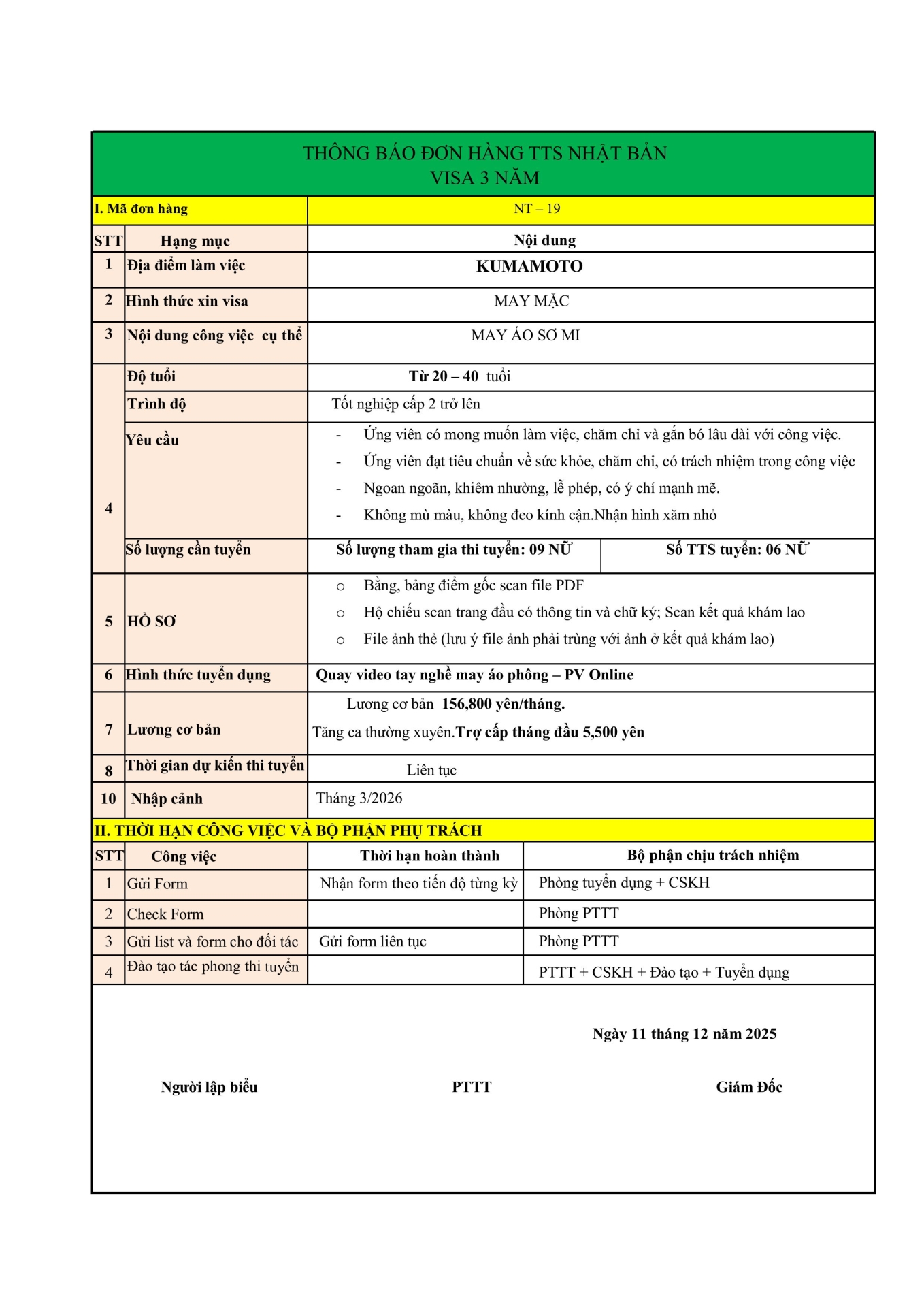 ĐƠN HÀNG XUẤT KHẨU LAO ĐỘNG MAY MẶC TẠI TỈNH KUMAMOTO
