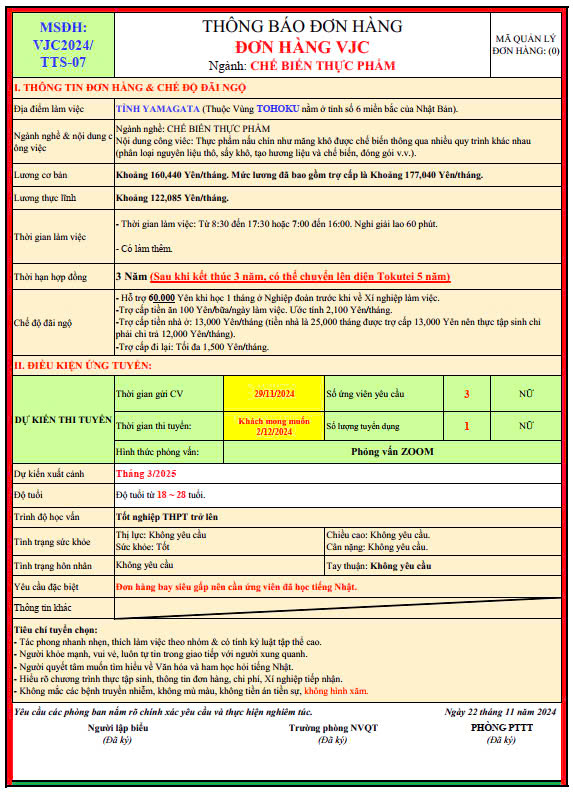 Ghi chú: Đơn hàng nhập cảnh gấp nên ưu tiên các ứng viên đã học tiếng Nhật.