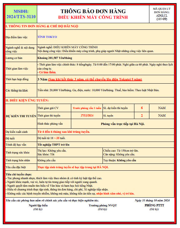 ĐƠN HÀNG XUẤT KHẨU LAO ĐỘNG NHẬT BẢN VẬN HÀNH MÁY CÔNH TRÌNH